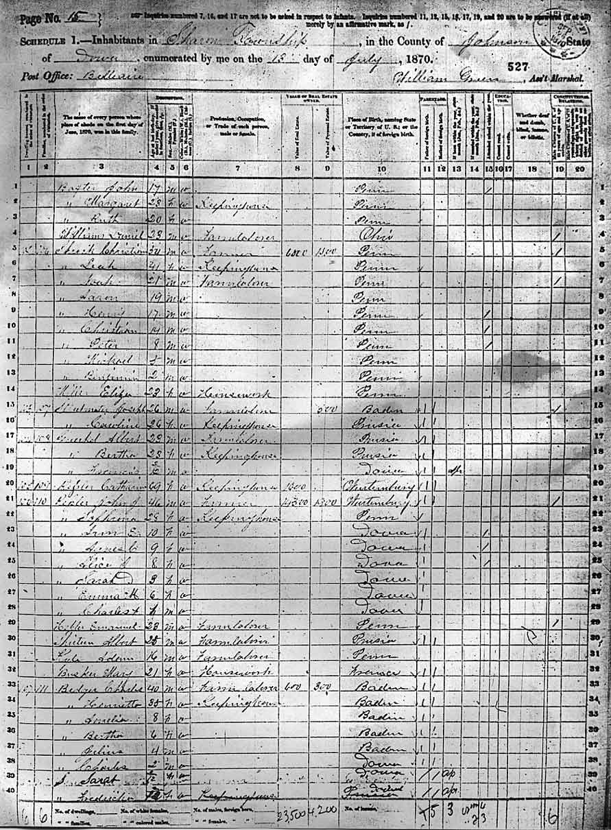 From Page 15 [stamped 527] (image): Sharon Twp, Johnson Co, Iowa 1870 Census